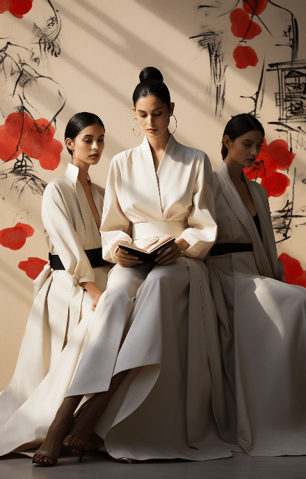 A trio of high fashion models, each representing different aspects of Chinese culture - poetry, tea ceremony, and calligraphy. Ultra wide angle shot, they are posing dynamically, each interacting with symbols of their aspects. The background is a minimalist setting with a strong contrast of light and shadow. Shot for Harper's Bazaar by Erik Madigan Heck. --ar 9:14 --s 250 --style raw --v 6.0