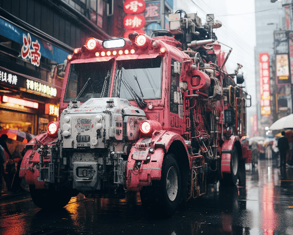 Close shot by david fincher, a transparent garbage truck in a busy cyberpunk kabukicho district in neo - tokyo 3303, cyberpunk geishas and cyberpolice, haze and rain --ar 5:4 --s 250 --style raw --v 6.0