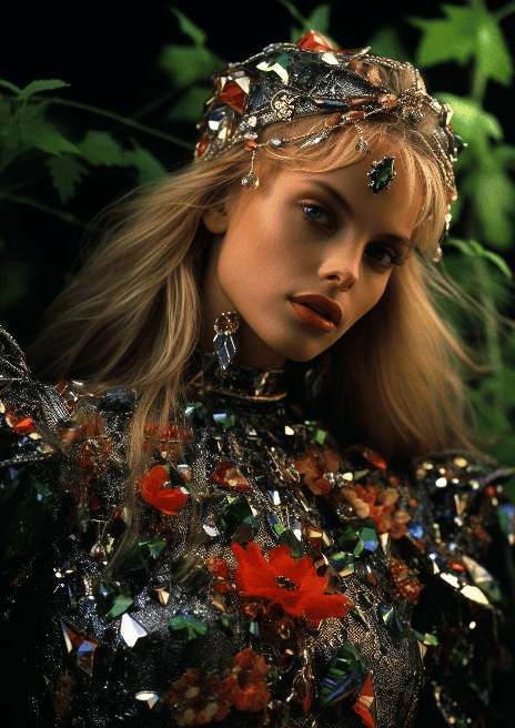 A high-fashion model in a Versace gown adorned with sparkling gems that echo the dew on the vibrant forest foliage around her. Close up shot for Cosmopolitan by Bruno Barbey captures the forest's jewel-like beauty --ar 5:7 --s 250 --style raw --v 6.0