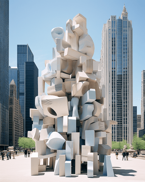 A symphony of geometric shapes in Chicago, realized by Kenzo Tange, captures the spirit of the metropolis. The ultra wide angle shot reveals a monumental sculpture park in the heart of the city, replete with tourists exploring its wonders --ar 4:5 --s 250 --style raw --v 6.0
