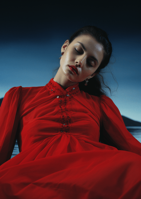 A compelling image of a high fashion model floating on a calm lake, draped in a vibrant red Qipao dress that glimmers in the moonlight. Her pose is relaxed, yet commanding, eyes closed as if lost in a dream. Wide view, W Magazine, by Alec Soth --ar 5:7 --s 250 --v 6.0