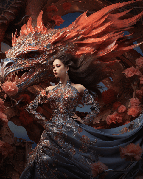 Fantasy Album Cover: A mythical dragon with iridescent scales and flowing silk-like wings soars across a crimson sky, carrying a high-fashion model on its back. The model, wearing an elegant ensemble inspired by Chinese phoenix motifs, strikes a fearless pose as she embraces the fantastical creature. The composition features an extreme close-up to capture the model's determination and beauty. This awe-inspiring album cover, shot by Zhang Jingna, blends elements of Chinese culture with high fashion, transporting viewers to a world of dreams and magic. --ar 4:5 --s 250 --style raw --v 6.0