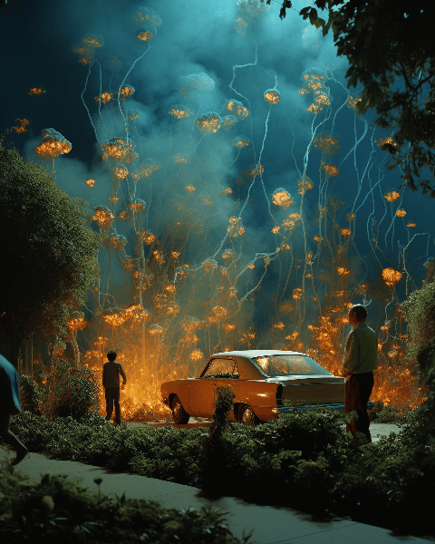 Visualize a world where city parks flourish with biomechanical flora, their metallic branches pulsing with neon life The wide view showcases this fascinating fusion of nature and technology in hyper-detailed, cinematic style by Alex Prager --ar 4:5 --s 250 --style raw --v 6.0