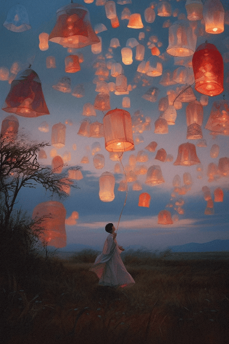 A whimsical sight of paper lanterns floating against the twilight sky, captured in a wide view by Tim Walker. The lanterns cast a warm glow, creating a dreamlike tableau that melds tradition with beauty --ar 2:3 --s 180 --v 6.0