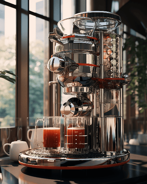 A refined coffee machine, earning the Red Dot Design Award, masterfully recreated as a gleaming tower of chrome and glass, nestled within a minimalist, sunlit café with espresso cups and coffee beans scattered artistically --ar 4:5 --s 250 --v 6.0