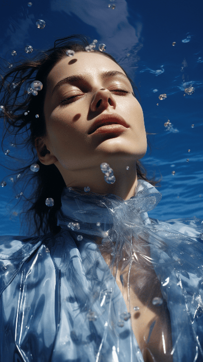 A model in a Prada ensemble of deep blue, her form harmonizing with the endless expanse of the ocean behind her. Low angle view shot for AnOther by David LaChapelle captures the serenity of the sea --ar 9:16 --s 250 --style raw --v 6.0