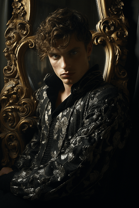 Fashion image featuring a male model in a baroque-inspired ensemble, in a contemplative pose, against a gilded, ornate mirror. Medium: Esquire. Artist: Nadav Kander --ar 2:3 --s 250 --style raw --v 6.0