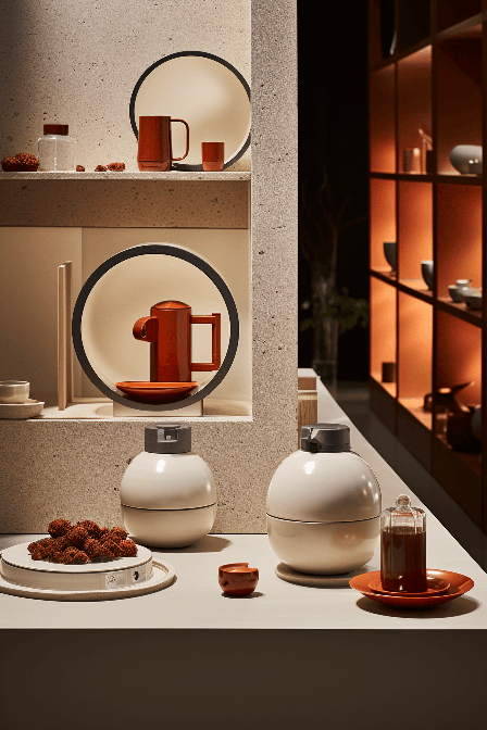 A Red Dot Design Award-winning coffee machine, revamped into a modern, ceramic sculpture, positioned in a minimalist cafe environment, paired with artisan coffee beans and hand-thrown mugs --ar 2:3 --s 250 --v 6.0