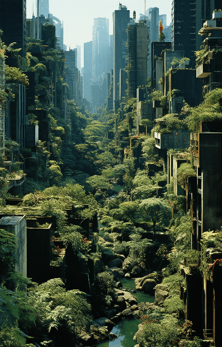 Explore a world where high-tech vines crawl up the skyscrapers of a bustling city. The aerial view captures the contrast between organic growth and the city's rigid architecture in hyper-detailed, filmic style by John Waters --ar 9:14 --s 250 --style raw --v 6.0