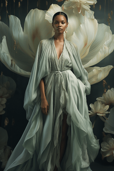A high fashion model, cloaked in a garment of shimmering fabrics, stands on a giant lotus, full body shot. The radiant beauty captured by Elie Saab for V Magazine, set in a watercolor-like dreamscape of the Moon Rabbit legend --ar 2:3 --s 250 --style raw --v 6.0