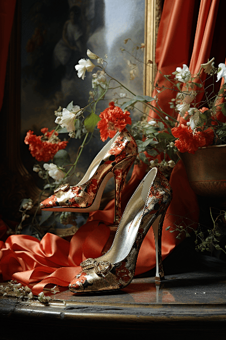 A pair of couture high heels, Professional Product Photography showcases the craftsmanship against a backdrop of smooth silk fabric, reflecting the stylish drama of Tim Walker's works --ar 2:3 --s 250 --v 6.0