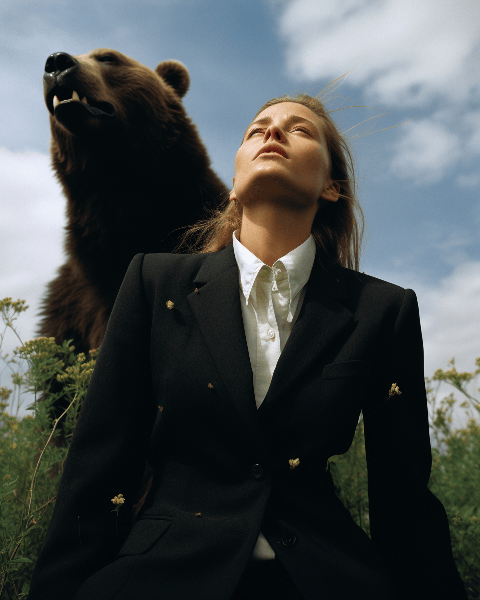 A model dressed in a sleek Balenciaga suit, her powerful pose echoing the might of a bear in the wild. Half body shot in Harper's Bazaar by Tim Walker. --ar 4:5 --s 250 --style raw --v 6.0