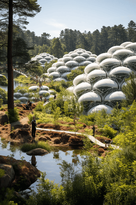 Bjarke Ingels conceives a contemporary artists' commune nestled in a lush forest. In a close-up view, observe the giant, tessellated pods that blend seamlessly with the surrounding greenery, filled with artists immersed in their craft --ar 2:3 --s 250 --style raw --v 6.0