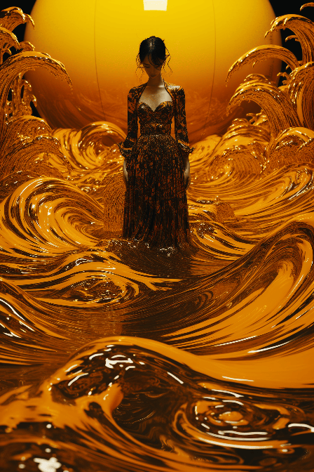 creative hyper realistic photo of acid yin Yang glitch ripples monochrome beauty queen in a mercury platinum chrome chandelier oil ink paint shiny tsunami water dance flamenco glitter graffiti beautiful intricate detail obake planet Tomoe Japanese comma fine art surrealism Wes Anderson style photography, color photography, Summicron - M 28 mm f/ 1. 8 --ar 2:3 --s 250 --style raw --v 6.0