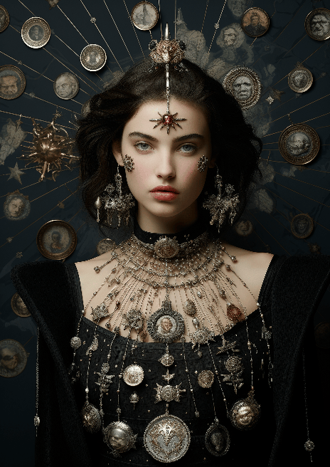 A cosmopolitan model presenting a statement ensemble, rich with celestial motifs inspired by the astronomical charts of medieval Europe. Featured in Harper's Bazaar, in a high angle shot by visionary artist Christian Dior --ar 5:7 --s 250 --style raw --v 6.0