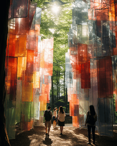 People around an installation made of semi - transparent colored sheets in the lush forest --ar 4:5 --style raw --s 250 --v 6.0