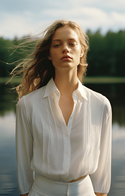 A model in a minimalist design by Ralph Lauren, her pose capturing the tranquility of a serene lake in the wilderness. Profile shot in GQ by Erik Madigan Heck. --ar 9:14 --s 250 --style raw --v 6.0