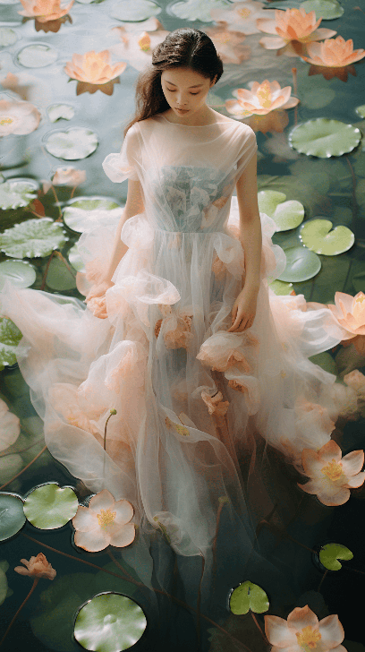 A woman in a large dress floats among water lilies The scene, captured in a low angle view, blends surreal photography with an abstract aesthetic, a blend of pastel colors and intricate details that evoke a dreamy beauty by Rinko Kawauchi --ar 9:16 --s 250 --style raw --v 6.0