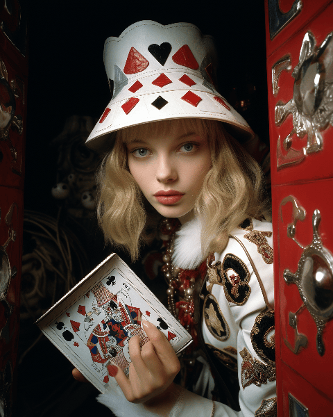 Alice in Wonderland in high fashion, model peeking into a designer handbag, ultra-wide angle, Vanity Fair, by Versace --ar 4:5 --s 250 --style raw --v 6.0
