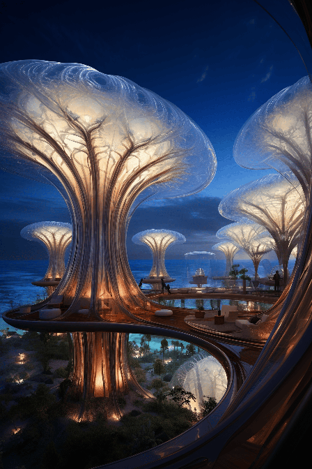 Immerse yourself in an underwater hotel designed by Vincent Callebaut, taking the form of a bio-luminescent jellyfish. With a close-up view, accentuate the radiant lights and structures that mimic a creature of the deep, all beautifully captured in the blue twilight of the sea floor --ar 2:3 --s 250 --style raw --v 6.0