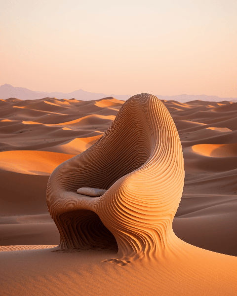 A uniquely shaped chair visualized on Instagram, captured in photography as a sculpted sand dune, its gentle curves softened by a golden sunset over a tranquil desert expanse --ar 4:5 --s 250 --style raw --v 6.0