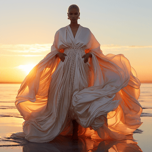 A radiant model posing on an ethereal beach at sunset, donned in an avant-garde Balenciaga creation. Her demeanor is calm and serene, as she gazes into the horizon. Ultra wide angle, Vogue, by Ralph Lauren --ar 1:1 --s 250 --v 6.0