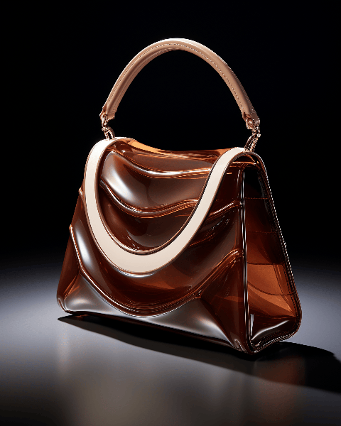 Handbag, inspired by the minimalist design aesthetics, showcases a blend of light luxury and modern minimalism. Rendered in 3D, the design boasts a unique shape, with fluid forms and stunning images reflecting off its shiny leather surface. The bag is presented in a commercial photography style under studio lighting for ultra-detail in UHD --ar 4:5 --s 250 --style raw --v 6.0