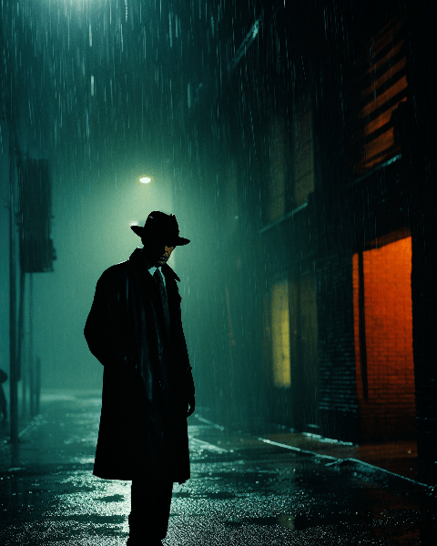 An enigmatic figure in a black suit and fedora, standing under a streetlight in a rain-soaked alley. Profile shot capturing the shadows and the glow of a cigarette, evoking a film noir atmosphere, by Alex Webb --ar 4:5 --s 250 --style raw --v 6.0