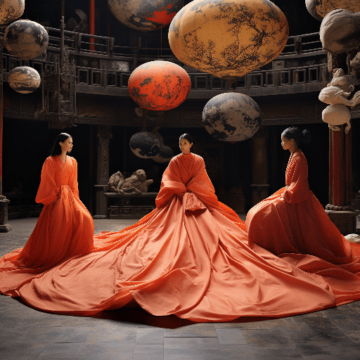 An aerial view captures a trio of models in chic silk gowns, against the backdrop of a stunningly crafted Beijing Opera stage. This image, a Vogue exclusive, exhibits the visual mastery of photographer Jamie Hawkesworth, as it exudes a vibrant fusion of tradition and fashion. --ar 1:1 --s 250 --style raw --v 6.0