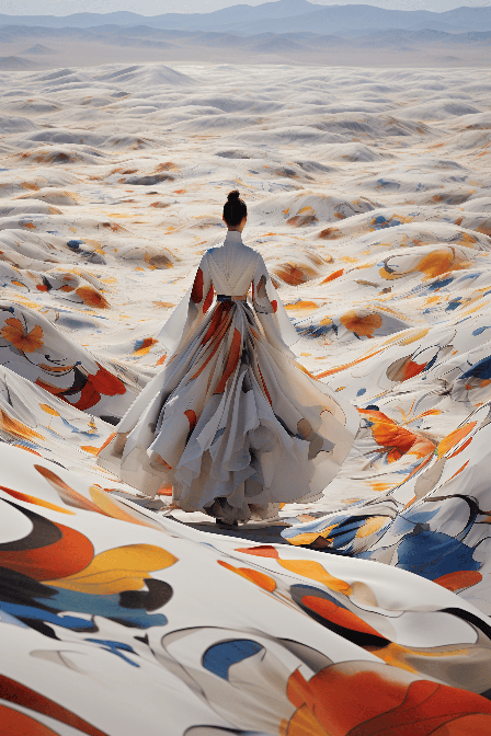 Journey through a dreamscape as a model, wearing Valentino, gracefully dances with a Chinese kite. Asymmetrical composition, for Dazed & Confused by Andreas Gursky --ar 2:3 --s 250 --style raw --v 6.0