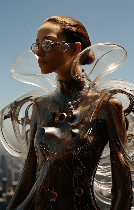 Model in an expressive pose, clad in a futuristic outfit by Iris van Herpen, amidst a cityscape buzzing with flying cars. Profile shot, for GQ by Edward Burtynsky. --ar 9:14 --s 250 --style raw --v 6.0