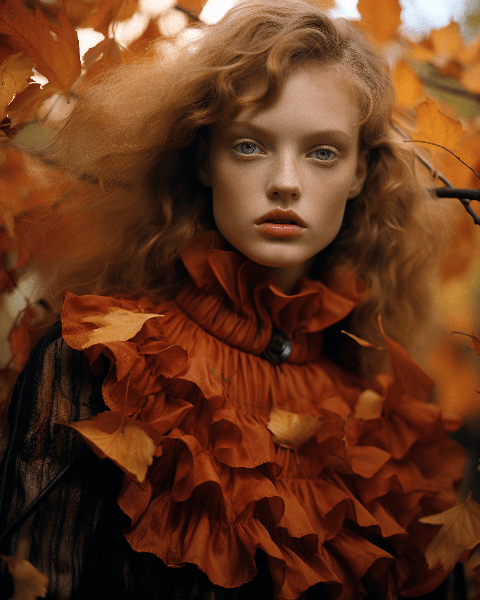The twilight of autumn: A fashion model in a layered Prada outfit poses against a backdrop of russet maple leaves. This low angle view shot by Bruno Barbey for AnOther Magazine captures the melancholic beauty of autumn --ar 4:5 --s 250 --style raw --v 6.0