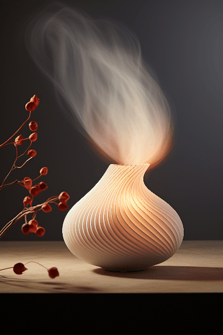 Envision an aromatherapy diffuser, embodying the balance of high tech design and Japanese Wabi-Sabi aesthetics. The diffuser, presented in stunning 3D detail, reveals a semi-transparent surface that emits a soft, calming glow. The image, captured under studio lighting, presents the diffuser in ultra-high detail against a nature-inspired background, creating an atmosphere of tranquility and harmony with nature --ar 2:3 --s 250 --style raw --v 6.0