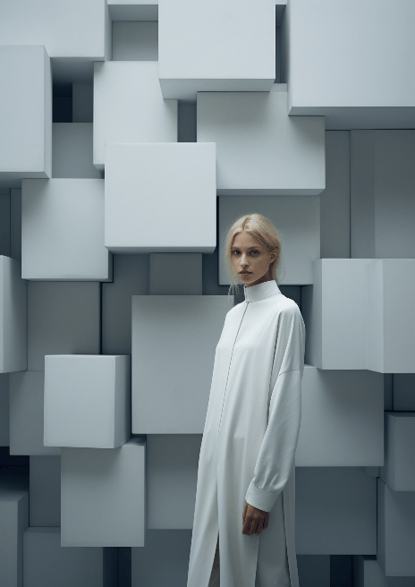 In an ultra-modern, minimalist environment, a model in avant-garde attire poses with a stoic expression. An asymmetrical composition captures the stark contrast between the model and the sparse surroundings. This image draws from the stark visual language of Akos Major and the surreal stylings of Alastair Magnaldo. --ar 5:7 --s 250 --style raw --v 6.0