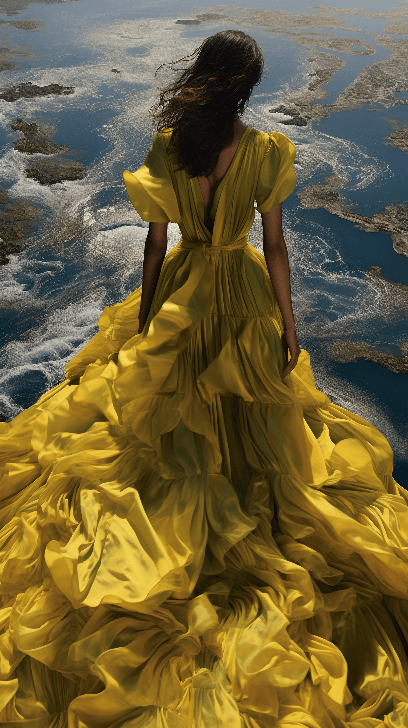 A model floats above an otherworldly landscape, her Versace outfit cascading like a waterfall. Aerial view, Vogue, by Alessandra Sanguinetti --ar 9:16 --s 250 --style raw --v 6.0