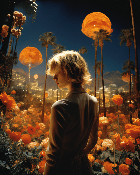 Picture a botanical garden where cybernetic roses bloom, their metallic petals reflecting the neon cityscape. The wide view captures this surreal blend of nature and technology in hyper-detailed, cinematic style by Alex Prager --ar 4:5 --s 250 --style raw --v 6.0