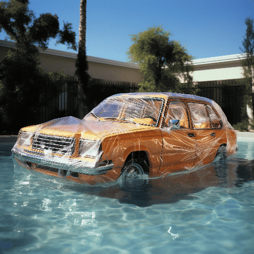 A car wraped of plastic inflatable, floating in a swiming pool, no sense, photography, national geographic photography, photorealistic, realistic, extreme details, kodak portra 800, leica found photograph, retro, photoreal, occult, photorealistic, uncanny valley, hyperreal, extreme detail, unreal engine, Fuji Superia 1600, mamiya 645, HD, gradual mopping, oversized, oversized, matte fabric, balenciaga style, dramatic, bold, high quality, positive, 8K, innovative prise avec un objectif grand angle, high Contrast, 8K, Cinematic Lighting, ethereal light, intricate details, extremely detailed, incredible details, full colored, complex details, Photoshoot, Multiverse --s 250 --style raw --v 6.0