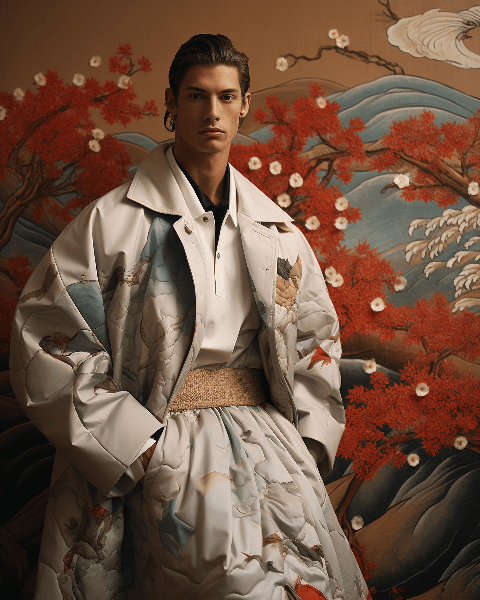 A charismatic male model showcasing a jacket resembling a traditional Chinese landscape scroll painting. Shot in wide view for GQ by innovative photographer Jamie Hawkesworth --ar 4:5 --s 250 --style raw --v 6.0