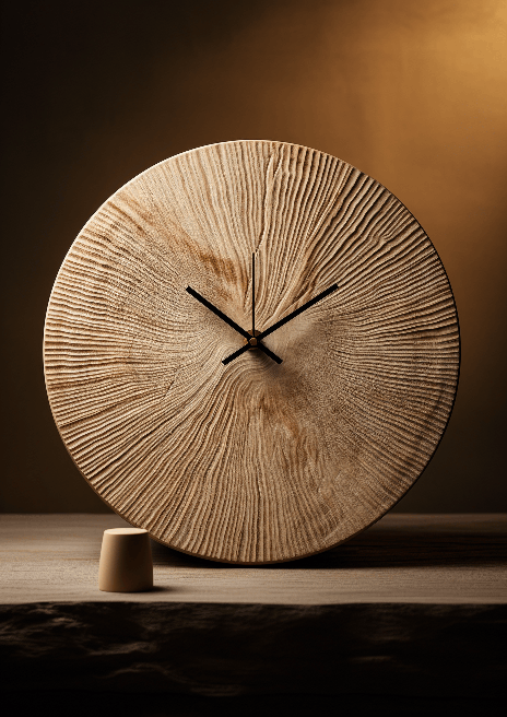 A tabletop clock inspired by the minimalist approach of Japanese Wabi-Sabi aesthetics. The clock beautifully exhibits the beauty in imperfection and transience. The simplistic composition is rendered in 3D with a wood texture, representing a quiet, natural atmosphere. The high resolution picture presents each intricate detail of the clock face and hands with utmost clarity. Ultra HD, 16K --ar 5:7 --s 250 --style raw --v 6.0