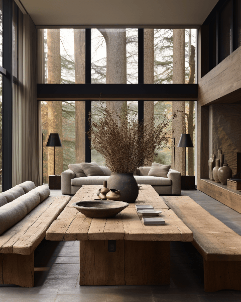 A designer dining table made of reclaimed wood set in an open plan living room with tall, paneled windows. The rustic aesthetics of the table juxtapose with the modernity of the surroundings, reminiscent of Georg Jensen's design language. --ar 4:5 --s 250 --v 6.0