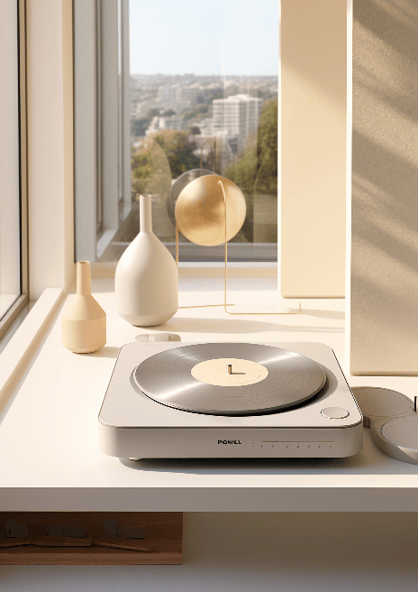 Visualize a project by Dwell. A modern, portable record player design featuring a clean background and simple composition. Influenced by Zaha Hadid's style, the product is a blend of futuristic and brutalist designs. Render it in hyper-realistic 3D, set on a cityscape balcony under soft studio light. Capture the scene in UHD, 16K resolution. --ar 5:7 --s 250 --style raw --v 6.0