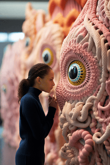 Ethnic woman looking inside an art museum, in the style of colorful biomorphic forms, knitted and crocheted, light pink and dark gold, contemporary animal sculptures, contemporary indian art, focus stacking, spiral group --ar 2:3 --s 250 --v 6.0