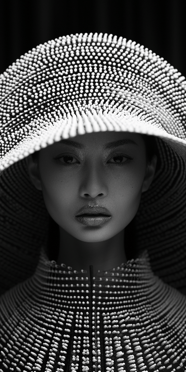 A woman in black and white with a large hat covering one side of her face, in the style of made of paperclips, intricate costumes, intricate weaving, ethereal sculptures, japanese photography, barbiecore, symmetrical --ar 1:2 --s 250 --style raw --v 6.0