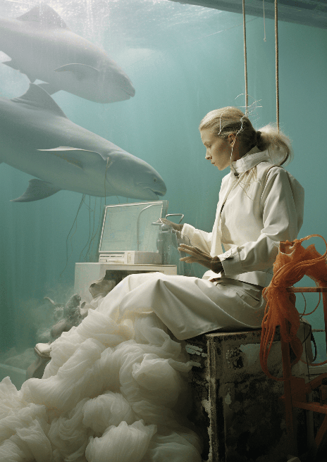 Dive into a surreal, underwater city inhabited by dolphins with advanced tech devices. The scene, captured from a low angle view, blends elements of the ocean and city life in a photorealistic style by Tim Walker --ar 5:7 --s 250 --style raw --v 6.0