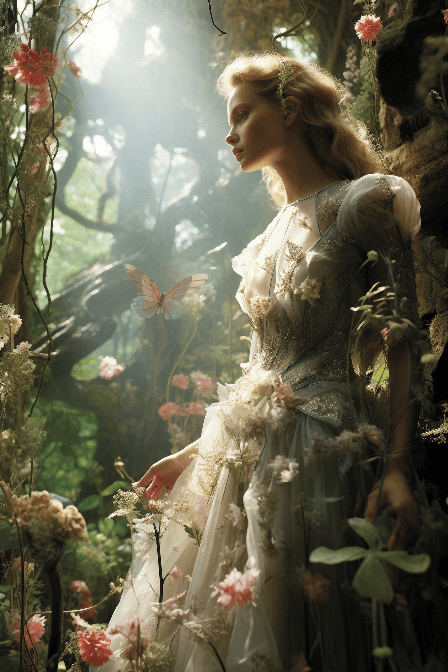 A high-fashion model in a flowing Elie Saab dress, posed amidst an enchanted forest. The profile shot for Marie Claire by Tim Walker harmoniously blends fashion with nature --ar 2:3 --s 250 --style raw --v 6.0