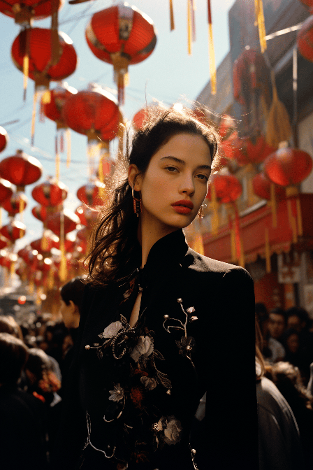 Model in a structured piece by Dior, her pose commanding, against the backdrop of a bustling Chinese festival. Low angle view, for Vanity Fair by Alex Webb. --ar 2:3 --s 250 --style raw --v 6.0