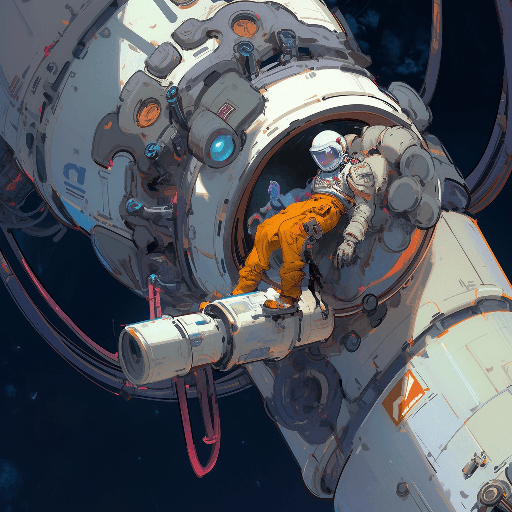 In the 3D model art style, a robot is performing maintenance on a spaceship's exterior. In the background, a beautiful nebula illuminates the scene. Perspective: Wide Angle. Composition: Rule of Thirds. Environment: Outer space with a vibrant nebula. Artist: Alex Webb --ar 1:1 --style expressive --s 400 --niji 5
