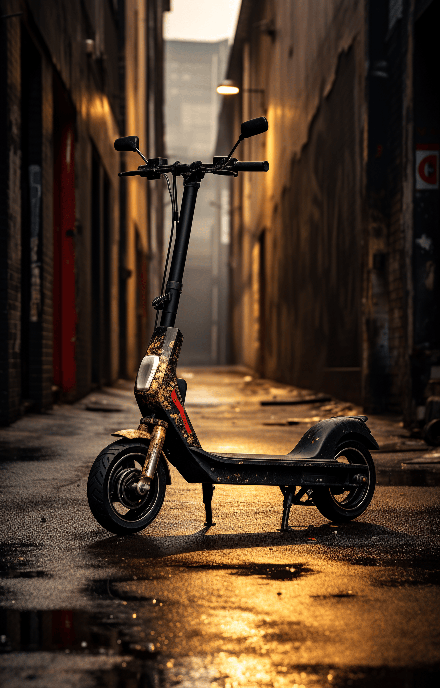 A retro-inspired electric scooter standing against a graffitied brick wall. The scooter's sleek design contrasts with the urban grittiness of the background, in a style inspired by Nick Knight's high-contrast photography. --ar 9:14 --s 250 --v 6.0