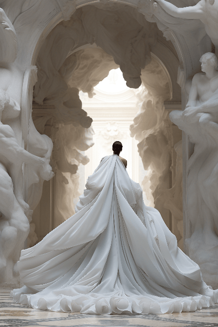 Full body shot of a high-fashion model in a billowing Valentino gown of pure white, her figure standing out starkly against a minimalist white marble courtyard. Captured by Nadav Kander for Vogue, this image celebrates the elegance of monochrome --ar 2:3 --s 250 --style raw --v 6.0