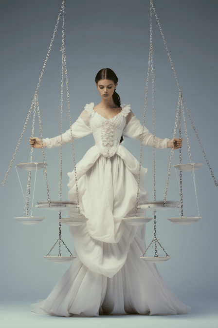 Dressed in a delicate Chanel gown, a model mirrors the balance of Libra. Full body shot, in Vogue, with an equilibrium scale subtly incorporated, captured by Tim Walker. --ar 2:3 --s 250 --style raw --v 6.0